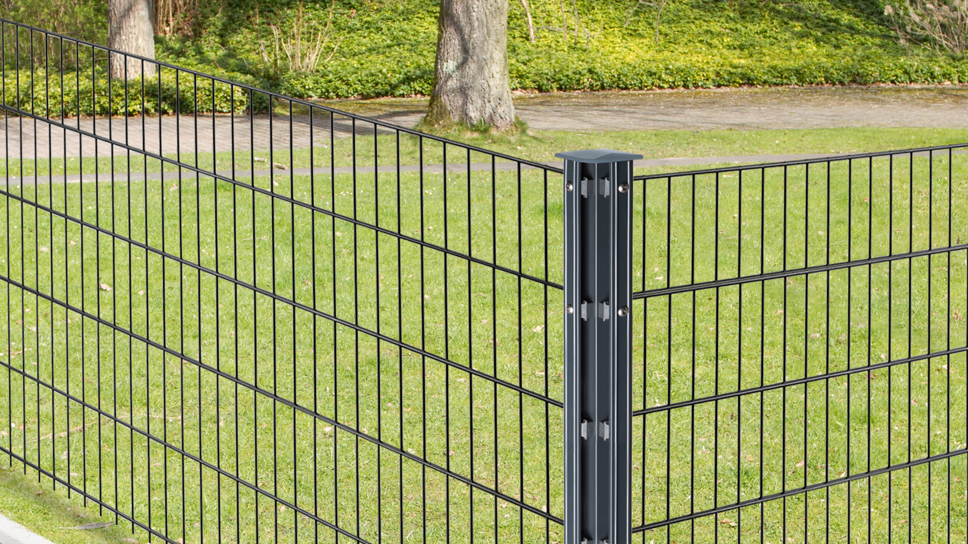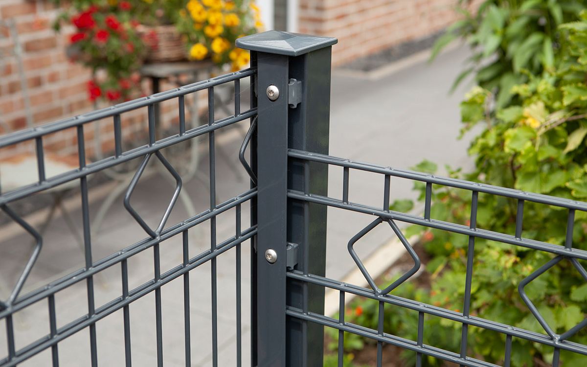 Der stabile Pfosten dämmt Geräusche, da die Distanzhalter den direkten Kontakt von Zaungitter und Pfosten verhindern. Der Pfosten wird mit bereits vormontierten Kunststoffhaltern und einer Aluminiumabdeckkappe geliefert. Ebenfalls dabei sind die nötigen Zaunbauschrauben aus Edelstahl.