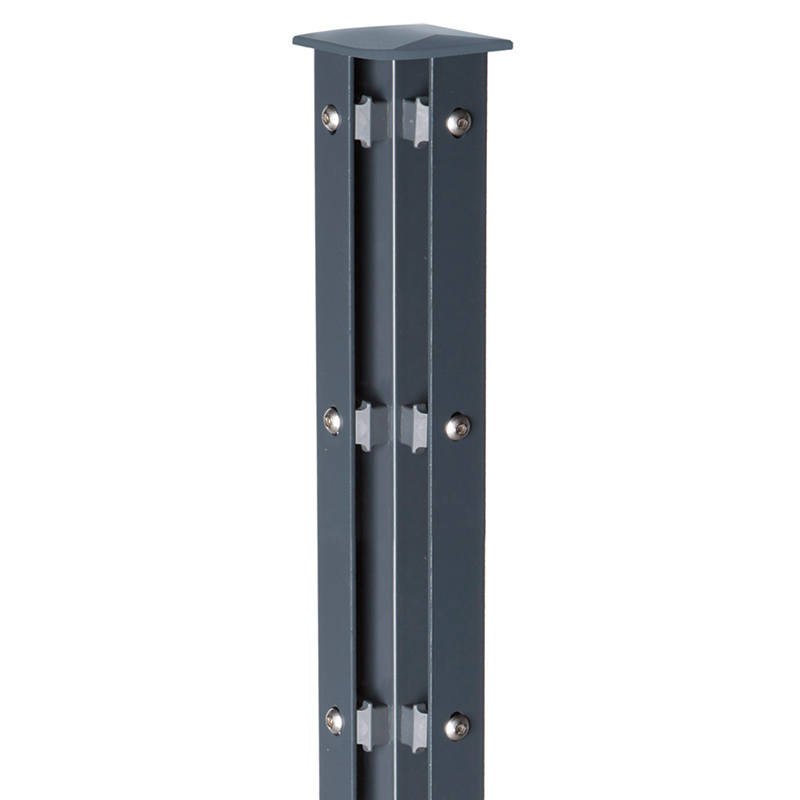 Je nach gewünschter Gittermattenhöhe ist der Eckpfosten von 1100 mm bis 3000 mm Höhe incl. Bodeneinstand erhältlich. Die Eckpfosten werden gebohrt, genietet und montiert mit Gitterzaunklemmen geliefert und verfügen über eine Kunsstoff-Kappe.