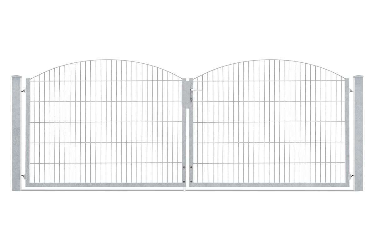 Das zweiflügelige Einfahrtstor VARIO Residenz INNSBRUCK/SYDNEY ist das passende Tor aus Doppelstabgitter zu den Schmuckzaunserien und lässt Sie die Öffnungsrichtung nach DIN links und rechts durch entsprechende Pfostenmontage bestimmen. Es kommt als Komplettpaket mit Schmuckzaunfüllung INNSBRUCK/SYDNEY von 6/6/6 mm, einem Rahmen von 40/40 mm und den zugehörigen Torpfosten von 80/80 mm zu Ihnen nach Hause. Aus Torhöhen von 630 mm bis 1030 mm können Sie das für Sie passende Tor auswählen, das eine lichte Weite von 3280 mm hat. Dabei wird die Höhe an der niedrigsten Stelle gemessen. Die Gittermatten steigen in der Mitte des Bogens um 200 mm an.