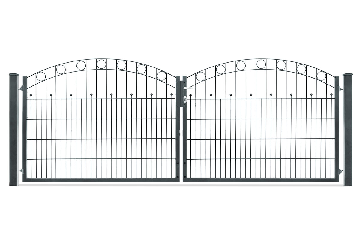 Das zweiflügelige Einfahrtstor VARIO Residenz WIEN ist das passende Tor aus Doppelstabgitter zu den Schmuckzaunserien und lässt Sie die Öffnungsrichtung nach DIN links und rechts durch entsprechende Pfostenmontage bestimmen. Es kommt als Komplettpaket mit Schmuckzaunfüllung WIEN von 6/6/6 mm, einem Rahmen von 40/40 mm und den zugehörigen Torpfosten von 80/80 mm zu Ihnen nach Hause. Aus Torhöhen von 830 mm bis 1430 mm können Sie das für Sie passende Tor auswählen, das eine lichte Weite von 3280 mm hat. Dabei wird die Höhe an der niedrigsten Stelle gemessen, in der Mitte des Bogens steigt die Höhe um 200 mm an.