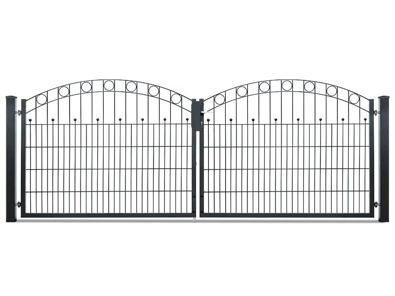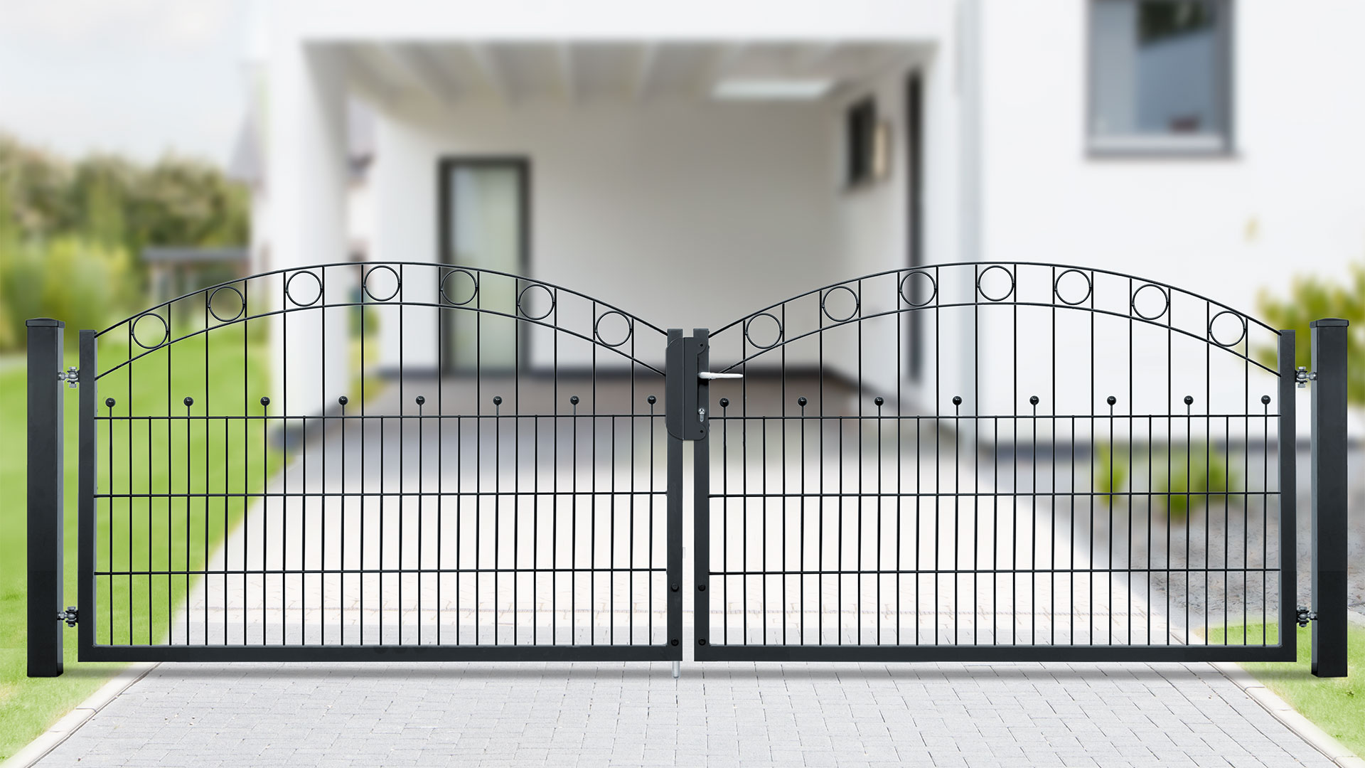 Das zweiflügelige Einfahrtstor VARIO Residenz WIEN ist das passende Tor aus Doppelstabgitter zu den Schmuckzaunserien und lässt Sie die Öffnungsrichtung nach DIN links und rechts durch entsprechende Pfostenmontage bestimmen. Es kommt als Komplettpaket mit Schmuckzaunfüllung WIEN von 6/6/6 mm, einem Rahmen von 40/40 mm und den zugehörigen Torpfosten von 80/80 mm zu Ihnen nach Hause. Aus Torhöhen von 830 mm bis 1430 mm können Sie das für Sie passende Tor auswählen, das eine lichte Weite von 3280 mm hat. Dabei wird die Höhe an der niedrigsten Stelle gemessen, in der Mitte des Bogens steigt die Höhe um 200 mm an.