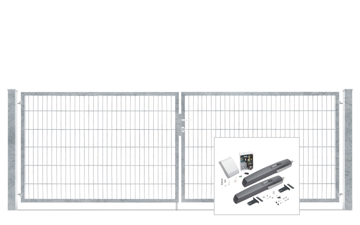 Das 2-flügelige Einfahrtstor VARIO compact verfügt über einen auf Gehrung verschweißten Rohrrahmen. Es ist ein stabiles und leichtgängiges Tor mit einem hochwertigen Abschluss durch stabilen Quadratrohrpfosten.