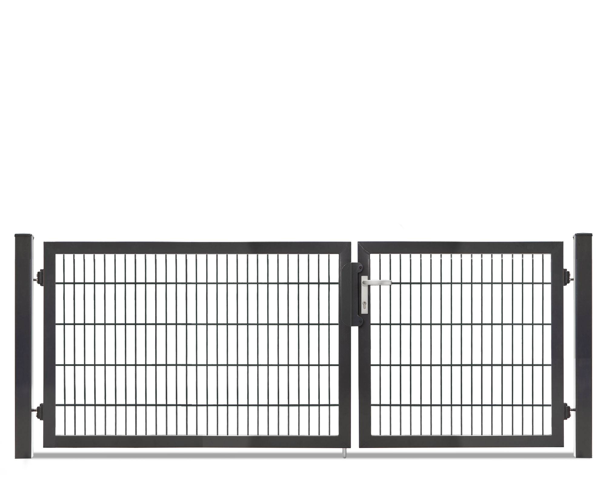 Die zweiflügelige Variante ist in sechs Breiten und sieben Höhen erhältlich, als zweiflügelige Toranlage bieten sich sowohl symmetrische als auch asymmetrische Kombinationsmöglichkeiten. Das Tor ist feuerverzinkt und pulverbeschichtet in RAL 7016 ab Lager verfügbar.