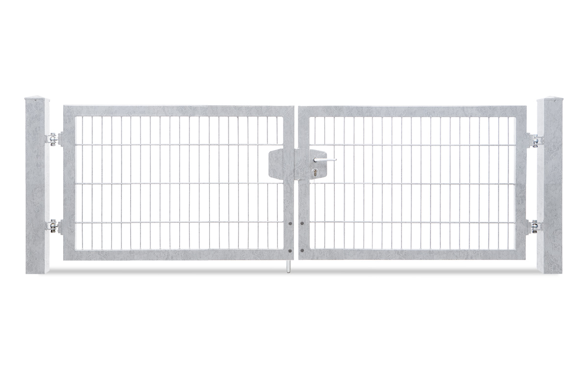 Das zweiflügelige Einfahrtstor VARIO trend lässt Sie die Öffnungsrichtung nach DIN links und rechts durch entsprechende Pfostenmontage bestimmen. Das variable Einfahrtstor kommt als Komplettpaket mit Doppelstabfüllung von 8/6/8mm, einem Rahmen von 60/40 mm und den zugehörigen Torpfosten je nach Höhe des Tores von 60/60 mm oder 80/80 mm zu Ihnen nach Hause. Aus zahlreichen Torhöhen und Torbreiten können Sie das für Sie passende Tor auswählen.