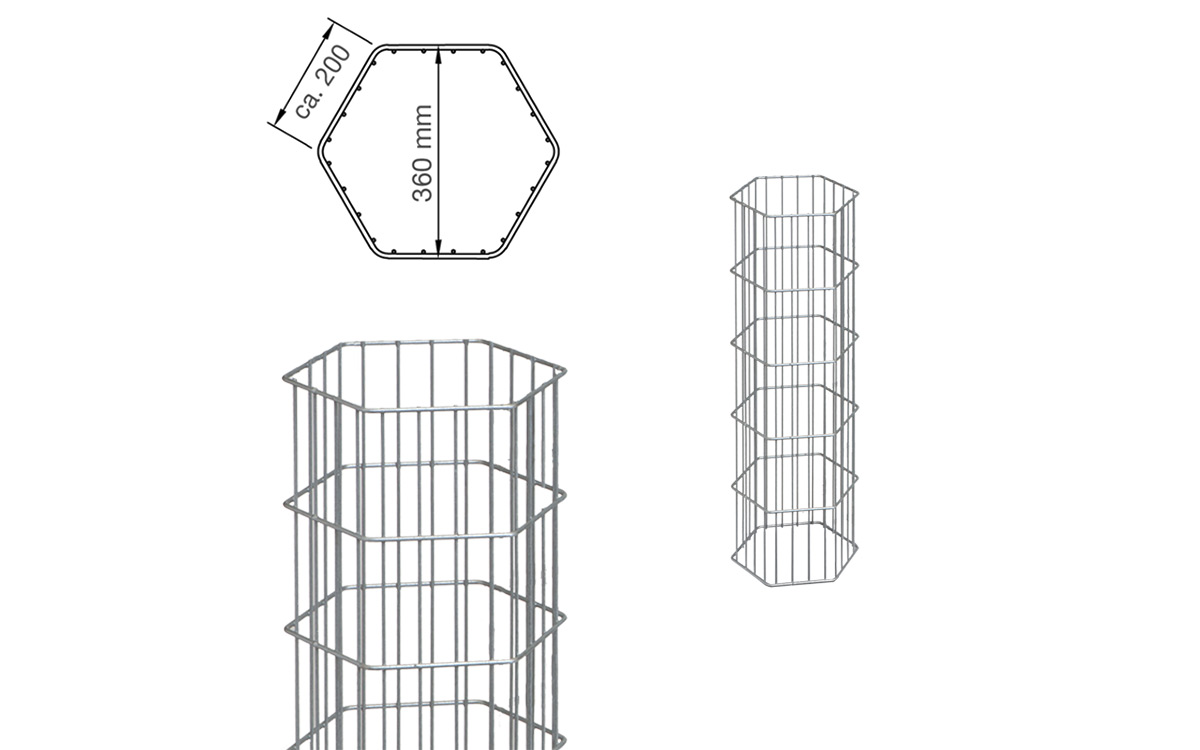 Die Gabionen-Säule ONYX besticht durch ihre sechseckige Form und ist individuell einsetzbar und befüllbar. Sie ist in der Tiefe von 360 mm, einer Kantenlänge von 200 mm und in Höhen von 1000 mm bis 2400 mm zu bekommen.