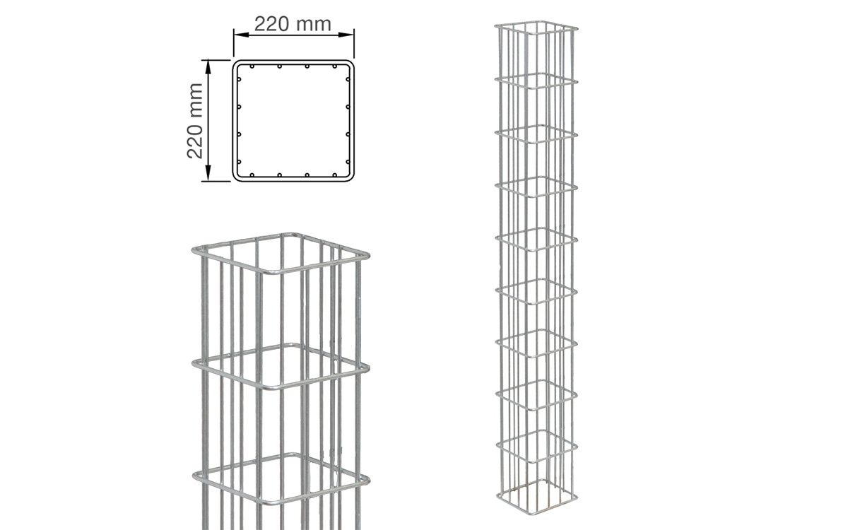 Gabionensäulen werden entweder einbetoniert oder auf ein Fundament mit Fußplatte aufgedübelt. Idealerweise werden die Säulen 60 cm tief einbetoniert, dementsprechend hoch sollte die Säule gewählt werden.