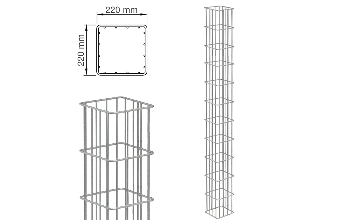 Gabionensäulen werden entweder einbetoniert oder auf ein Fundament mit Fußplatte aufgedübelt. Idealerweise werden die Säulen 60 cm tief einbetoniert, dementsprechend hoch sollte die Säule gewählt werden.
