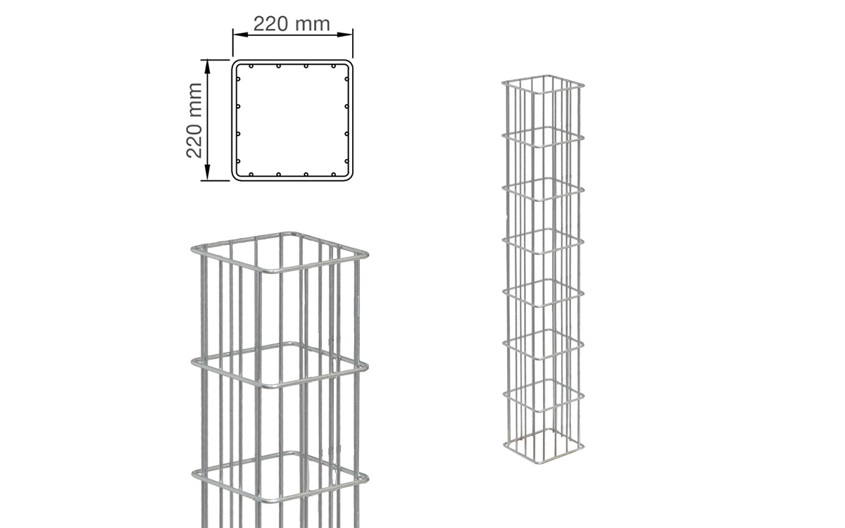 Gabionensäulen werden entweder einbetoniert oder auf ein Fundament mit Fußplatte aufgedübelt. Idealerweise werden die Säulen 60 cm tief einbetoniert, dementsprechend hoch sollte die Säule gewählt werden.