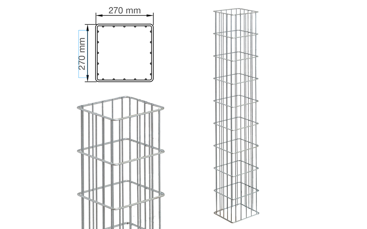 Die Gabionen-Säule wird in einem Stück gewickelt und mit den Schweißpunkten zwischen jedem waagerechten Draht dauerhaft verschlossen und kann mit Kieseln, Alpensteinen, Sandstein, Grobschlag, dunkelbraunem oder türkisen Glas befüllt werden.