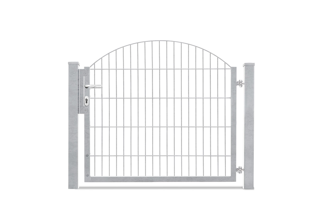 Bestechend für das einflügelige Gartentor VARIO Residenz INNSBRUCK ist der elegante Oberbogen. Dabei wird die Höhe an der niedrigsten Stelle gemessen. Die Gittermatten steigen in der Mitte des Bogens um 200 mm an.