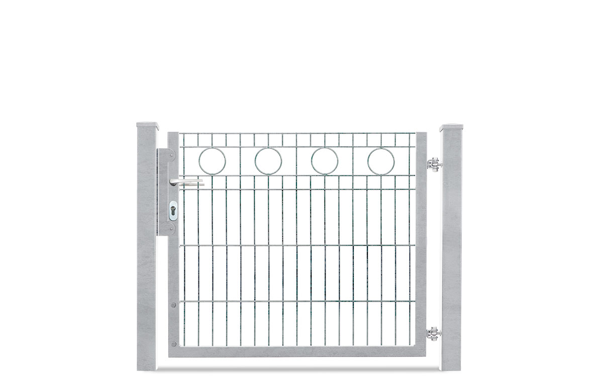 Das einflügelige Gartentor VARIO Residenz ROM ist das passende Tor aus Doppelstabgitter zur Schmuckzaunserie ROMund lässt Sie die Öffnungsrichtung nach DIN links und rechts durch entsprechende Pfostenmontage bestimmen. Es kommt als Komplettpaket mit Schmuckzaunfüllung ROMvon 6/6/6 mm, einem Rahmen von 40/40 mm und den zugehörigen Torpfosten von 80/80 mm zu Ihnen nach Hause. Aus Torhöhen von 830 mm bis 1230 mm können Sie das für Sie passende Tor auswählen, das eine lichte Weite (von Torpfosten zu Torpfosten) von 1030 mm hat. Inklusiv Schloss Aluminium Klinke und Profilzylinder.