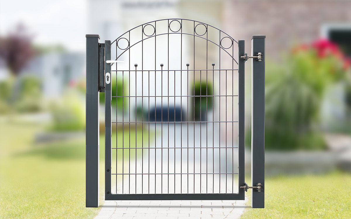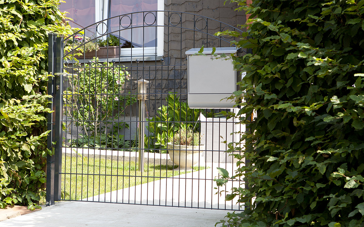 Bestechend für das einflügelige Gartentor VARIO Residenz WIEN ist der elegante Oberbogen, den im Verlauf kreisförmige Ornamente zieren. Die klassische Zierkugel ist im waagerechten Verlauf des Tors integriert.