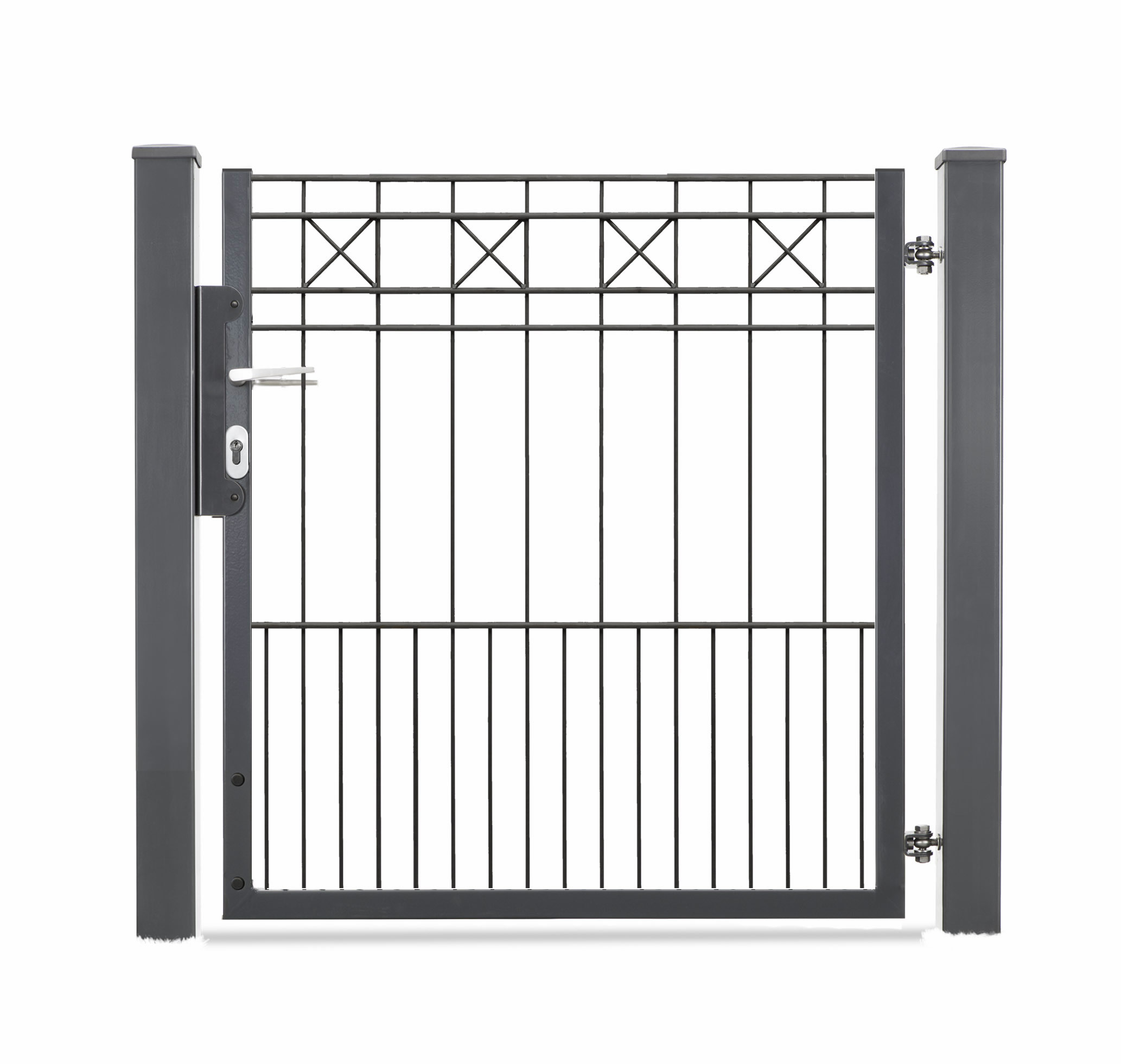 Das einflügelige Einfahrtstor VARIO Residenz klassik PISA ist das passende Tor aus Doppelstabgitter zur Schmuckzaunserie PISA und lässt Sie die Öffnungsrichtung nach DIN links und rechts durch entsprechende Pfostenmontage bestimmen. Das exklusive Tor beeindruckt durch die nostalgischen Kreuz-Ornamente, die traditionelle Optik mit zeitgemäßen Fertigunstechniken verbinden. Das Modell  VARIO Residenz klassik PISA bietet Sicherheit, Funktionalität und Eleganz auf höchstem Niveau.