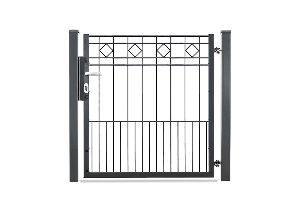 Das einflügelige Einfahrtstor VARIO Residenz Klassik TURIN ist das passende Tor aus Doppelstabgitter zur Schmuckzaunserie TURIN und lässt Sie die Öffnungsrichtung nach DIN links und rechts durch entsprechende Pfostenmontage bestimmen. Das exklusive Tor fasziniert durch die klassischen Rauten-Ornamente, die nostalgisches Flair mit zeitgemäßen Fertigungstechniken verbinden. Das Modell VARIO Residenz Klassik TURIN bietet Sicherheit, Funktionalität und Eleganz auf höchstem Niveau.