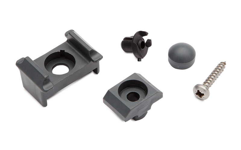 Punktbefestigungsset bestehend aus Gitterzaunklammer, Spreizdübel, Edelstahlschraube, Klemmstück, Stopfen