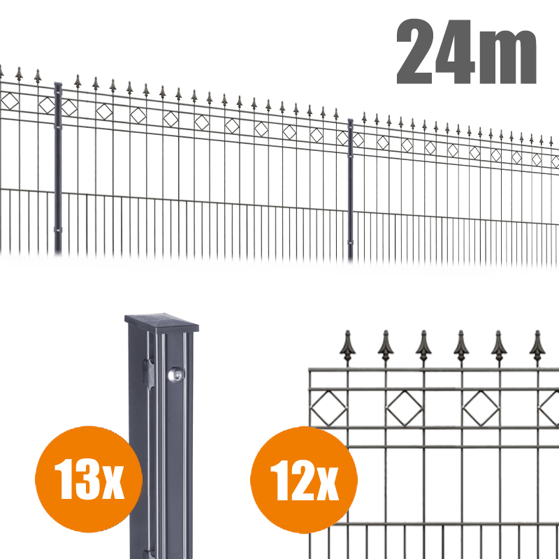 Feuerverzinkung und hochwertige Pulverbeschichtung garantieren eine außerordentlich lange Lebensdauer. Der Schmuckzaun RIMINI ist in der Farbe anthrazitgrau (RAL 7016) erhältlich. Als Höhen stehen 0.9 m und 1.1 m zur Verfügung. Darüber hinaus sind auch passende einflügelige Gartentore erhältlich.