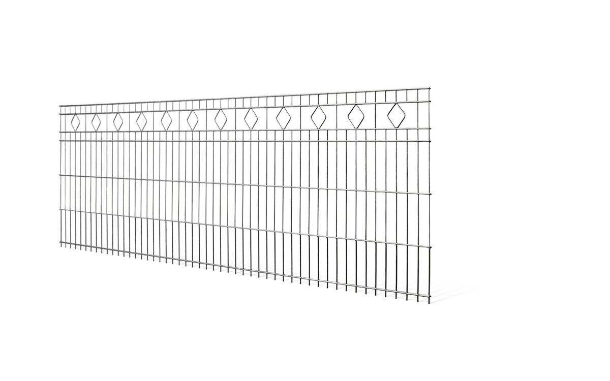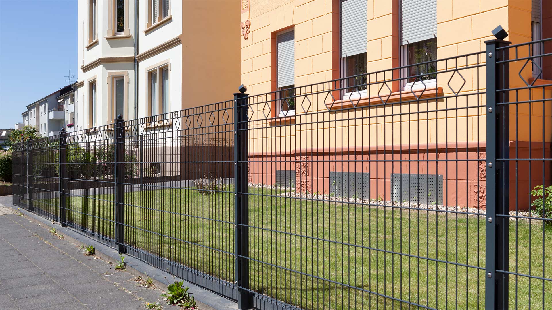 Der elegante Schmuckzaun BARCELONA ist zeitlos und passt sich vielen Stilrichtungen und Bepflanzungsarten an. Dabei bietet er Schutz und wahrt die Privatsphäre. Im obersten Segment der Doppelstabgittermatte befinden sich kleine rautenförmige Zierelemente, die durch waagerechte Einfassungen hervorgehoben werden. Der Schmuckzaun BARCELONA besteht aus massiven miteinander verschweißten Stahldrähten.