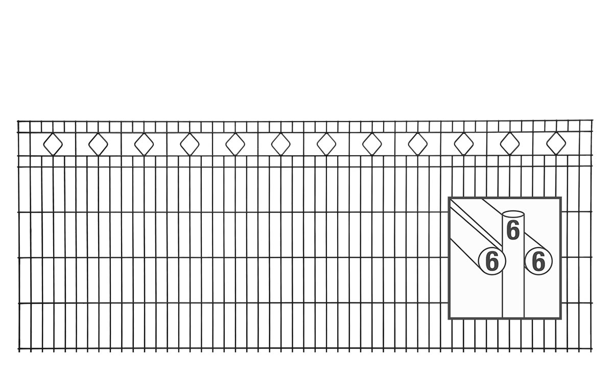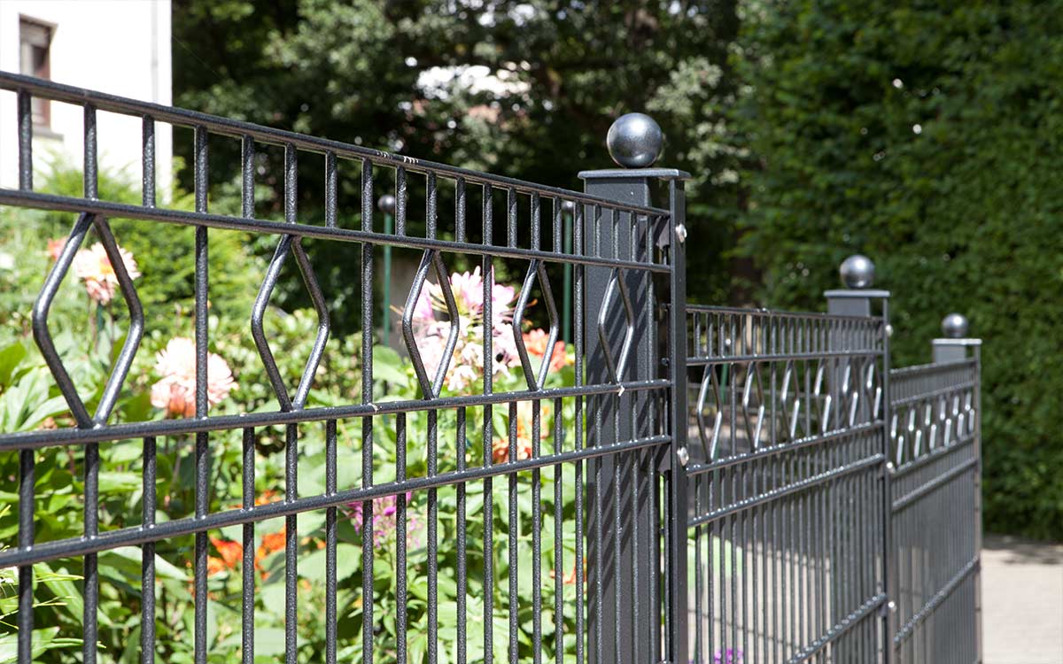 Der elegante Schmuckzaun BARCELONA ist zeitlos und passt sich vielen Stilrichtungen und Bepflanzungsarten an. Dabei bietet er Schutz und wahrt die Privatsphäre. Im obersten Segment der Doppelstabgittermatte befinden sich kleine rautenförmige Zierelemente, die durch waagerechte Einfassungen hervorgehoben werden. Der Schmuckzaun BARCELONA besteht aus massiven miteinander verschweißten Stahldrähten.