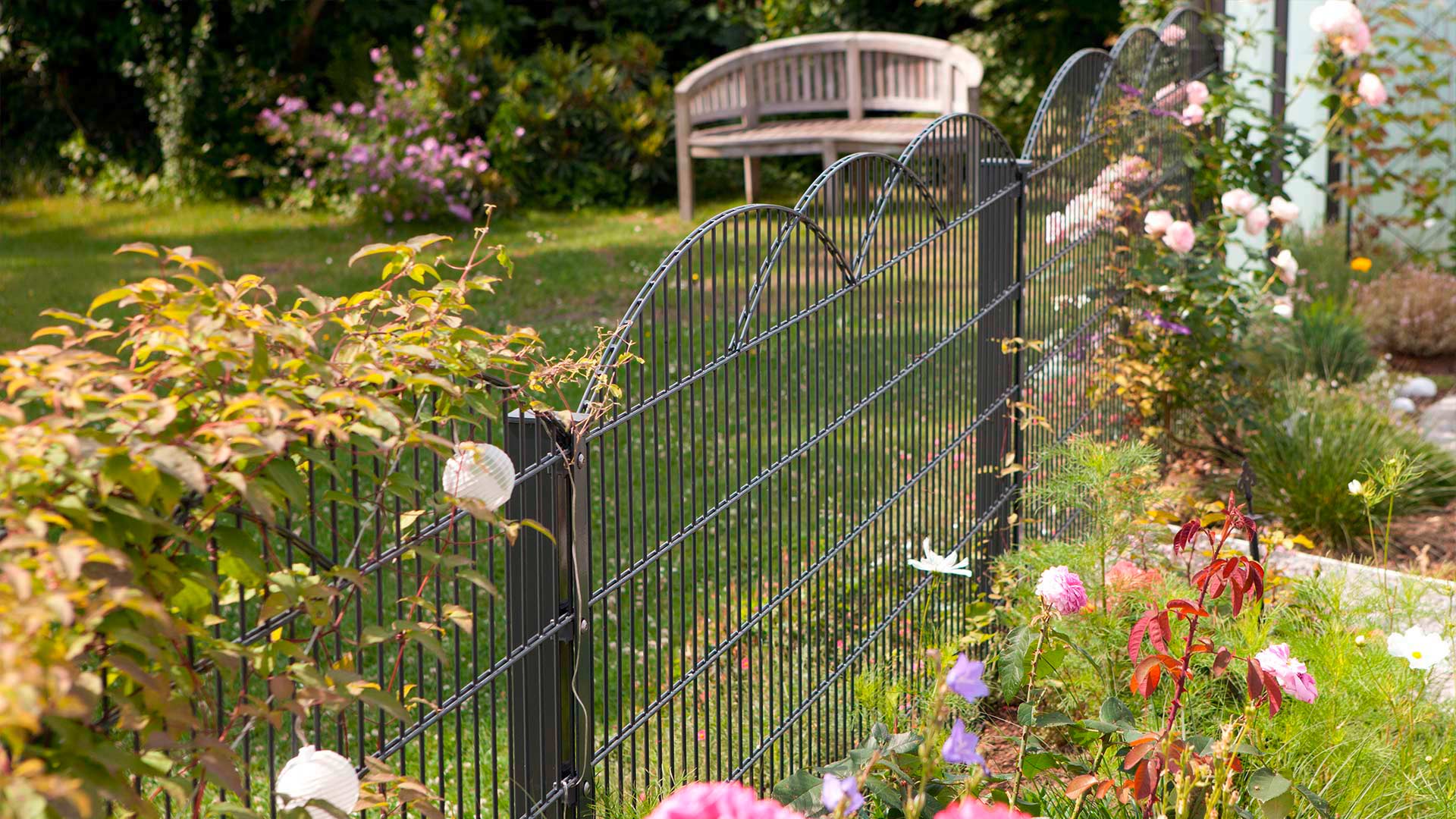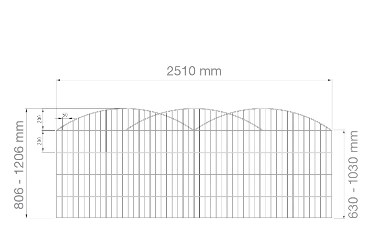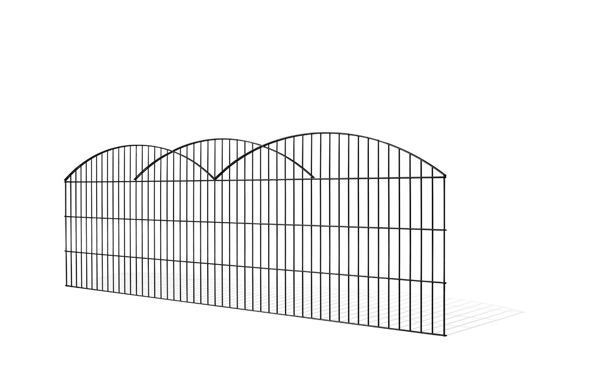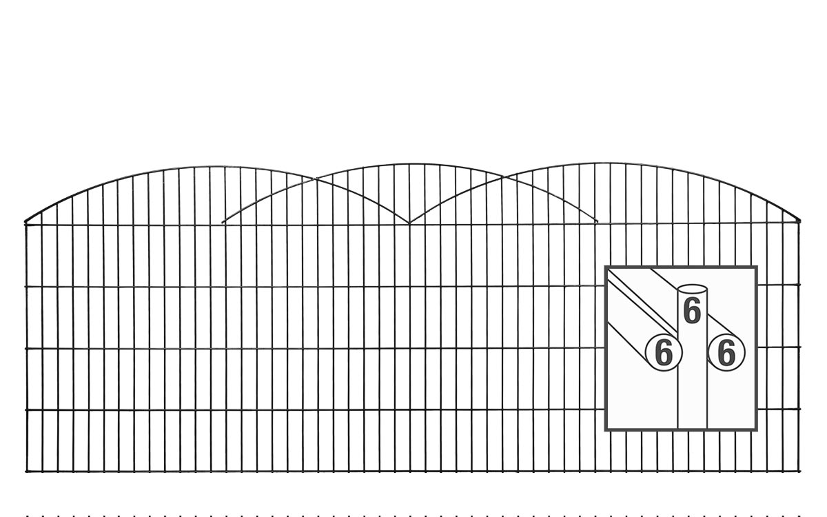Der Schmuckzaun eignet sich für die anspruchsvolle und moderne Gartengestaltung, ohne dabei die Sicherheitsaspekte zu vernachlässigen. Die drei ineinander übergehenden Oberbögen machen den besonderen Charme des Schmuckzauns aus. Dabei wird die Höhe in der Mitte des Bogens gemessen. Die Gittermatten fallen zum Ende um 200 mm ab.