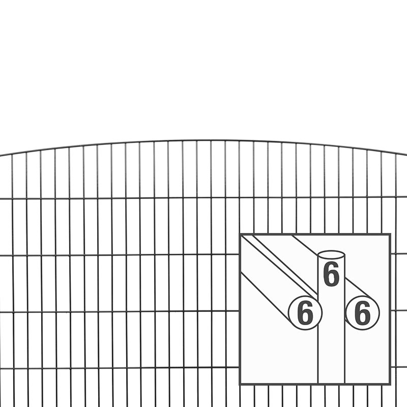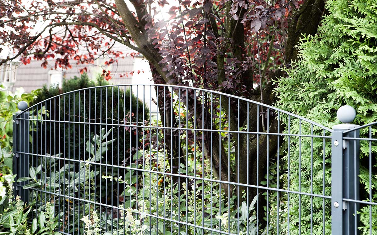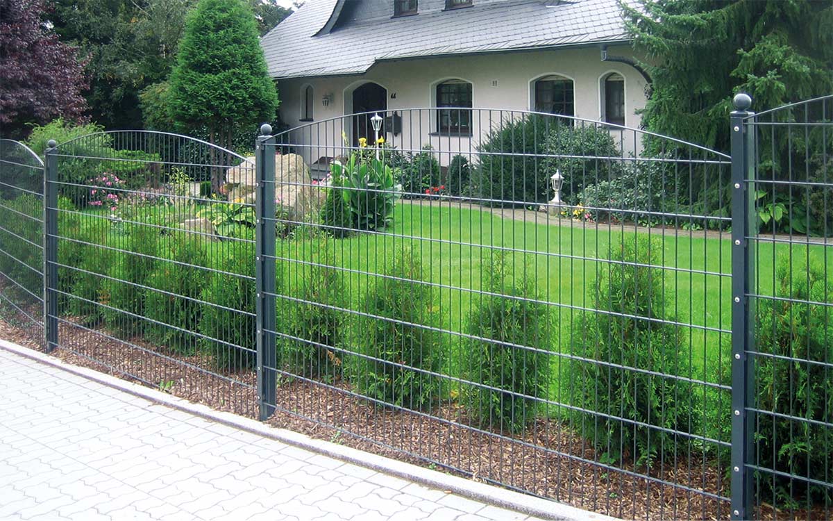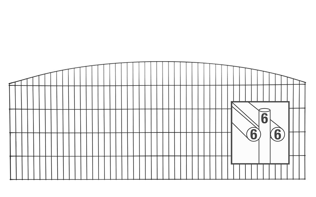 Der Bogenschmuckzaun SYDNEY besteht aus hochwertigem Doppelstabgitter und massiv miteinander verschweißten Stahldrähten mit einer Drahtstärke von 6 mm waagerecht und 6 mm senkrecht. Sie können den Schmuckzaun SYDNEY in den Höhen 806 mm, 1006 mm und 1206 mm erhalten.