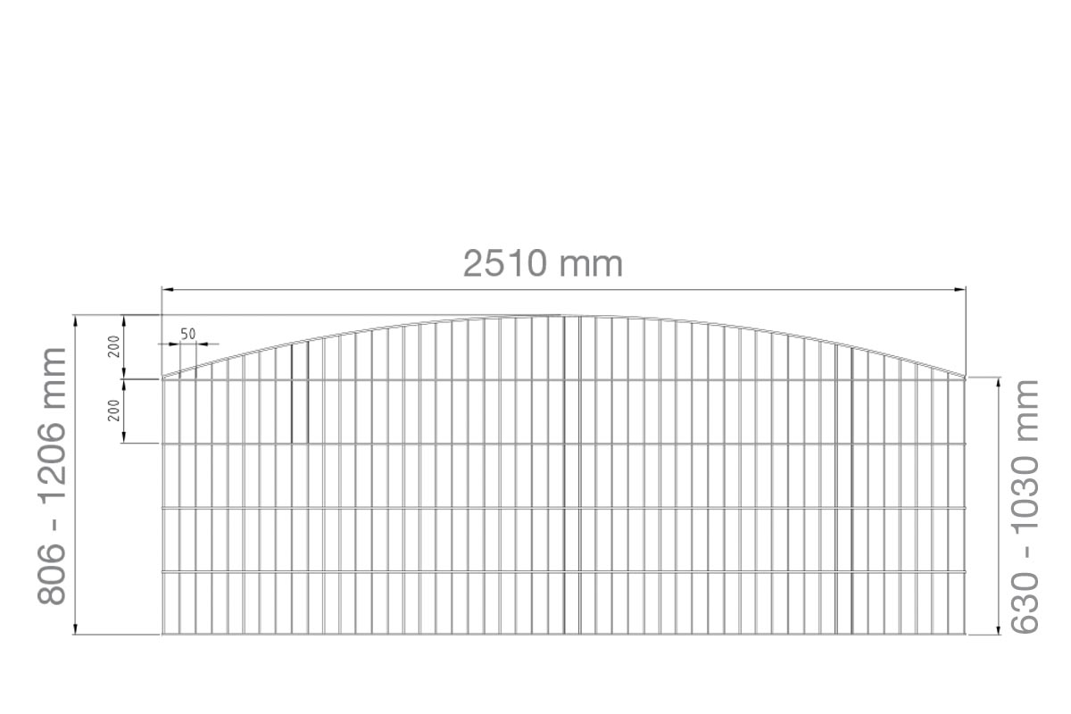 SYDNEY ist ein eleganter Bogenschmuckzaun. Edel und dennoch dezent schützt er ihr Zuhause. Der Oberbogen wirkt stilvoll und rundet ihre individuelle Garten- und Grundstücksgestaltung ab. Die Höhe des Zauns wird in der Mitte des Bogens gemessen. Die Gittermatten fallen zum Ende um 200 mm ab. Für die Wahl der richtigen Pfosten ist die Höhe am Ende der Zaunelemente zu berücksichtigen. Diese beträgt 630 mm, 830 mm und 1030 mm. Die Doppelstabgittermatte hat eine Länge von 2510 mm.