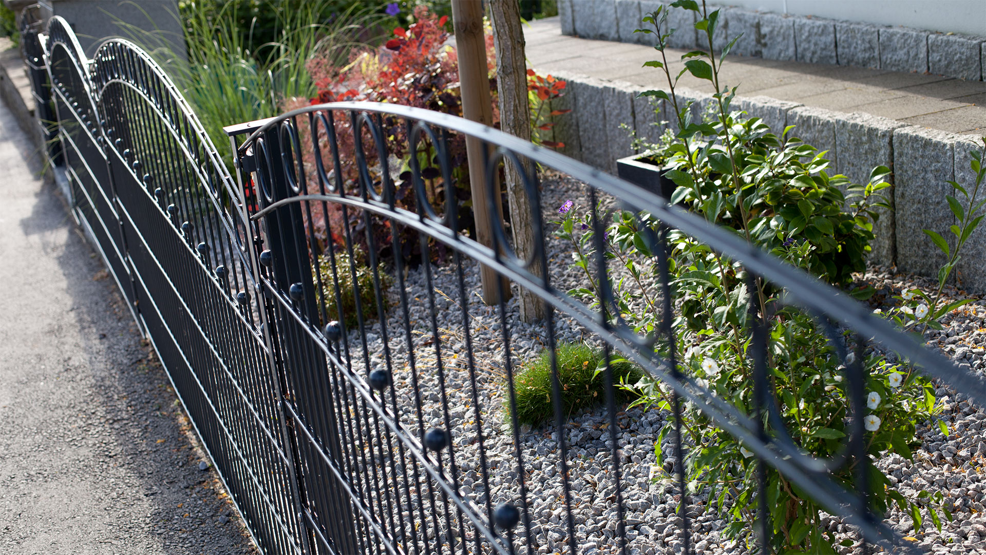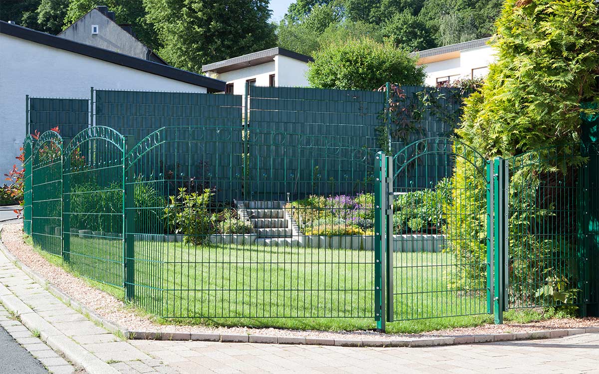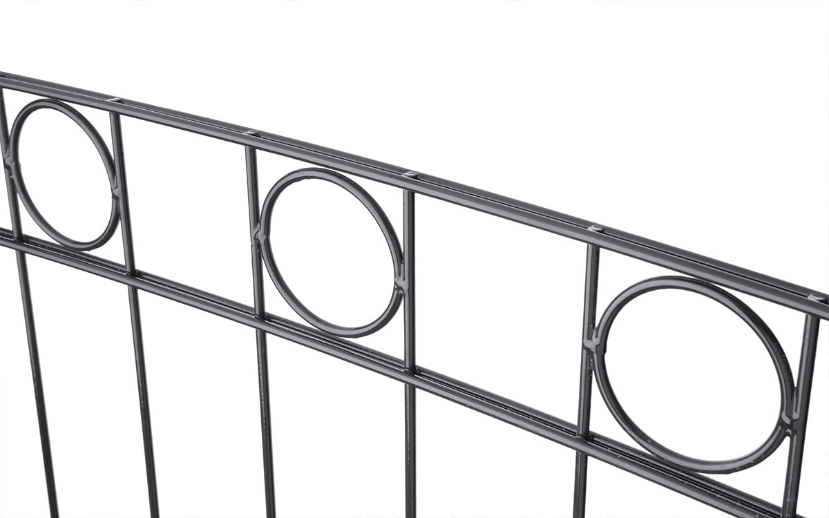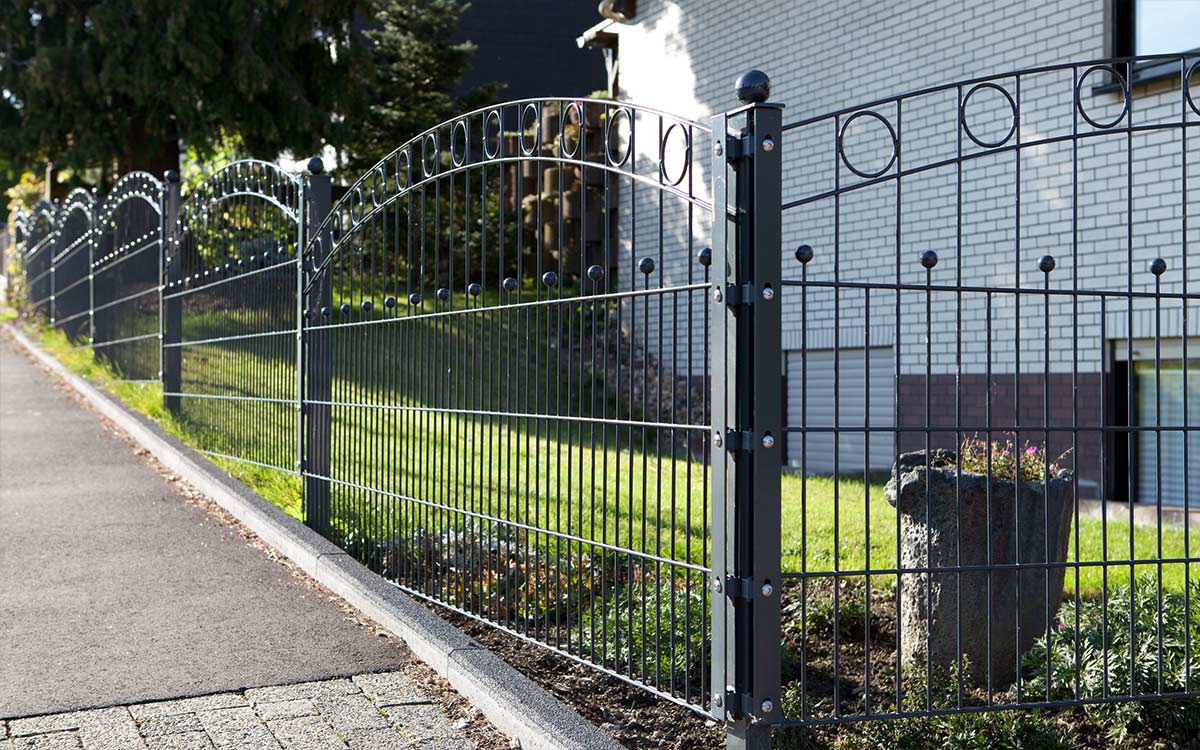 WIEN ist ein extravaganter Hingucker aus hochwertigem Doppelstabgitter. Bestechend ist der elegante Oberbogen, den im Verlauf kreisförmige Ornamente zieren. Die klassische Zierkugel ist im waagerechten Verlauf des Zauns integriert.