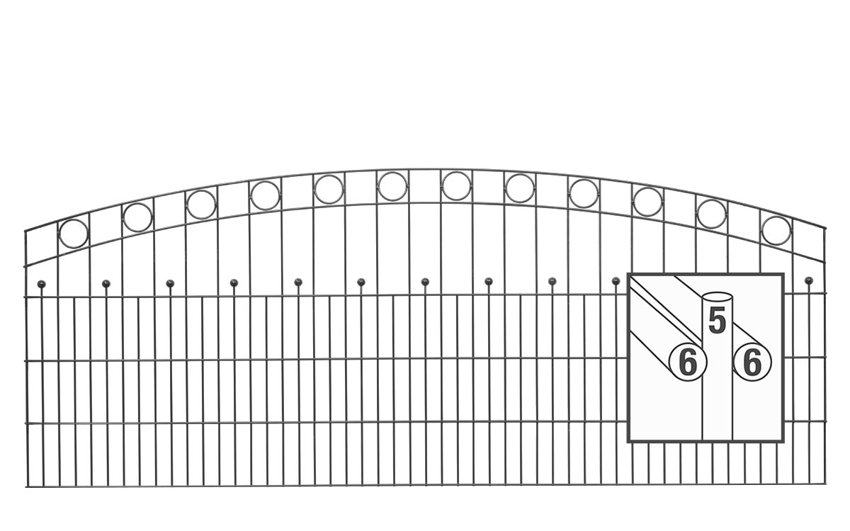 Der Schmuckzaun WIEN mit Oberbogen bietet eine Drahtstärke von 6 mm waagerecht und 6 mm senkrecht. Der Schmuckzaun WIEN ist in den Höhen 1006 mm, 1406 mm und 1606 mm