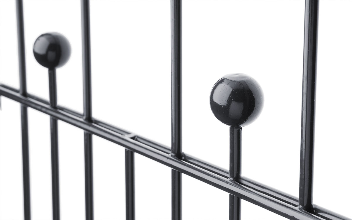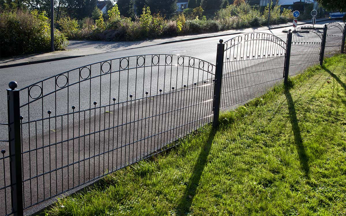 WIEN ist ein extravaganter Hingucker aus hochwertigem Doppelstabgitter. Bestechend ist der elegante Oberbogen, den im Verlauf kreisförmige Ornamente zieren. Die klassische Zierkugel ist im waagerechten Verlauf des Zauns integriert.