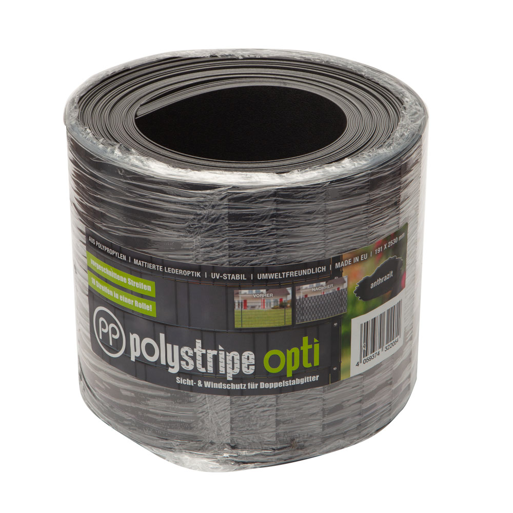 Der Sichtschutz |PP| polystripe opti hat nicht nur eine extrem lange Lebensdauer, er ist auch deutlich umweltverträglicher als vergleichbare Produkte. Durch die beidseitige Narbung bietet er eine optimale Haptik. Reflexionsfrei und mit einer Licht-Absorptionsrate von über 98% überzeugt |PP| polystripe auch optisch. |PP| polystripe setzt auf die Materialeigenschaft von Polypropylen (PP). Es wird in 2530 mm langen Streifen mit einer Höhe von 191 mm in einer Rolle mit 10 Streifen geliefert und passt somit perfekt zu fast allen Stahlgitterzäunen mit einer Maschenhöhe von ca. 200 mm. Dank intelligenter Spenderrolle ist |PP|polystripe opti einfach und schnell zu verarbeiten.