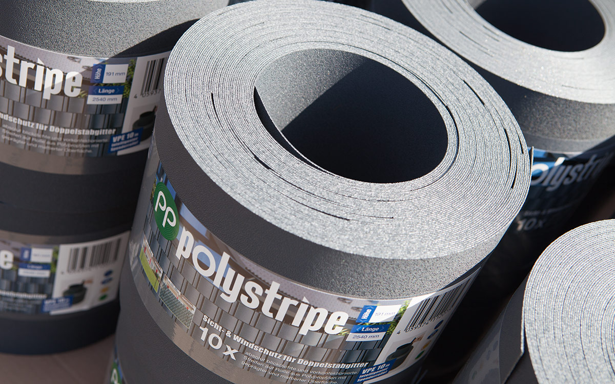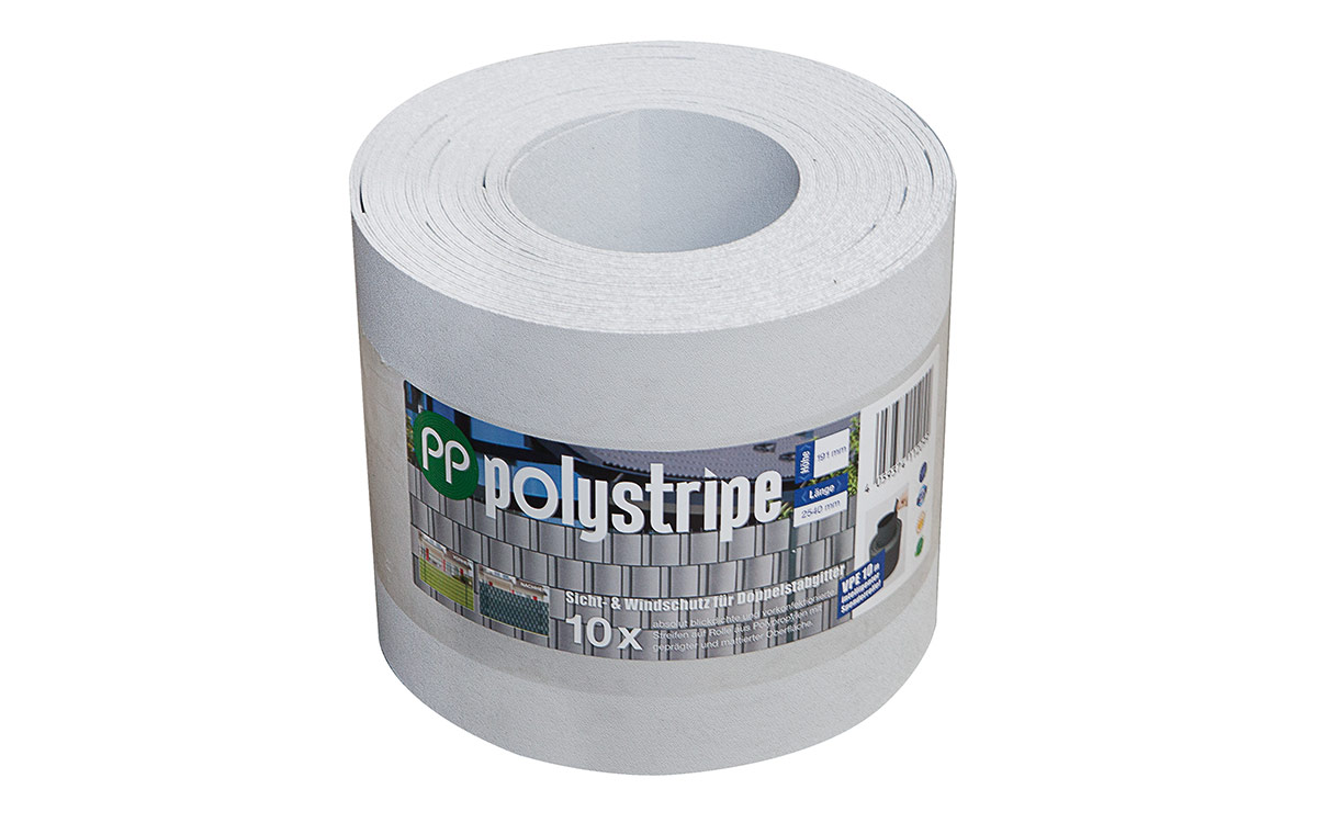 Der Sichtschutz |PP| polystripe hat nicht nur eine extrem lange Lebensdauer, er ist auch deutlich umweltverträglicher als vergleichbare Produkte. Durch die beidseitige Narbung bietet er eine optimale Haptik. Reflexionsfrei und mit einer Licht-Absorptionsrate von über 98% überzeugt |PP| polystripe auch optisch. |PP| polystripe setzt auf die Materialeigenschaft von Polypropylen (PP). Es wird in 2540 mm langen Streifen mit einer Höhe von 191 mm in einer Rolle mit 10 Streifen geliefert und passt somit perfekt zu fast allen Stahlgitterzäunen mit einer Maschenhöhe von ca. 200 mm. Dank intelligenter Spenderrolle ist |PP|polystripe einfach und schnell zu verarbeiten.