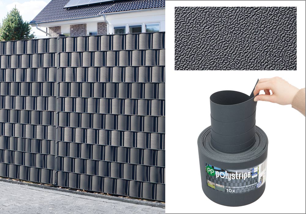 Der Sichtschutz |PP| polystripe ist vielseitig einsetzbar und wird in Doppelstabgittermatten eingeflochten. Darüber hinaus kann er auch als Sichtschutz für Torflügel aus den Serien VARIO trend und VARIO compact verwendet werden. Aufgrund der Festigkeit des Materials sind zur Fixierung keine Klemmschienen nötig, sofern der genutzte Zaunpfosten über eine Abdeckleiste verfügt.