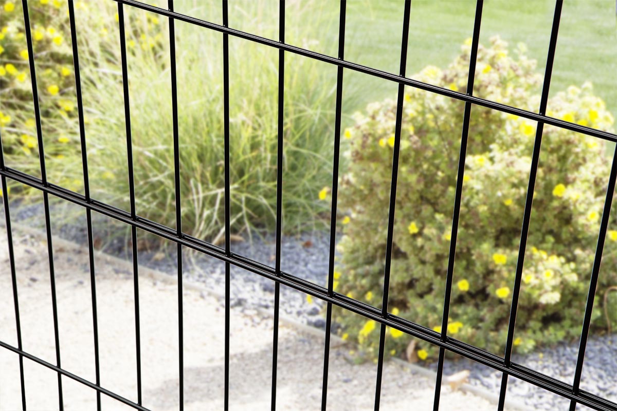 Der Gartenzaun BLACKY ist kein Doppelstabmattenzaun im klassischen Sinn. Im Gegensatz zu herkömmlichen Doppelstabmattenzäunen besitzt BLACKY nur jeweils ganz oben und ganz unten sowie auf Höhe von 60 cm Doppelstäbe. Dadurch wird Gewicht und Material gespart, was sich auch im günstigen Preis des schwarzen Stabmattenzauns niederschlägt.