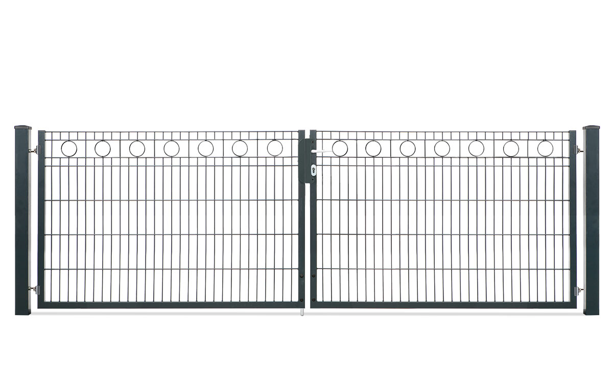 Das zweiflügelige Einfahrtstor VARIO Residenz ROM ist das passende Tor aus Doppelstabgitter zur Schmuckzaunserie ROM und lässt Sie die Öffnungsrichtung nach DIN links und rechts durch entsprechende Pfostenmontage bestimmen. Es kommt als Komplettpaket mit Schmuckzaunfüllung ROM von 6/6/6 mm, einem Rahmen von 40/40 mm und den zugehörigen Torpfosten von 80/80 mm zu Ihnen nach Hause. Aus Torhöhen von 830 mm bis 1230 mm können Sie das für Sie passende Tor auswählen, das eine lichte Weite von 3280 mm hat. Inklusiv Schloss, Aluminium-Klinke und Profilzylinder.