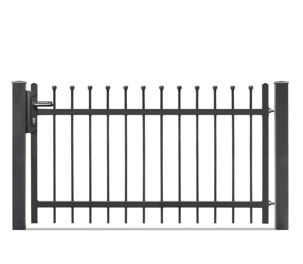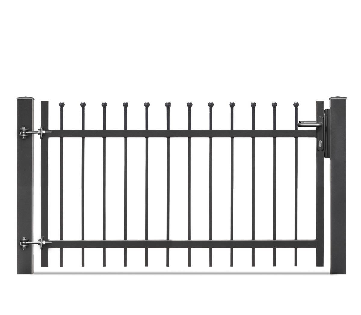Das Schmucktor VARIO Residenz  select+ DAVOS mit den klassischen Zierkugeln ist das passende Tor zu unserem Zaunmodell Residenzen select+ DAVOS. Es ist in zwei Breiten und vier Höhen als 1-flügelige Variante erhältlich. Als Einfahrtstor stehen die 2-flügelige Varianten mit den Lichten Weite von 3215 mm und 2095 mm (90° Öffnungswinkel) zur Auswahl. Alle Tore sind feuerverzinkt und hochwertig mit DB703 eisenglimmer pulverbeschichtet. Das garantiert eine langlebige Qualität.