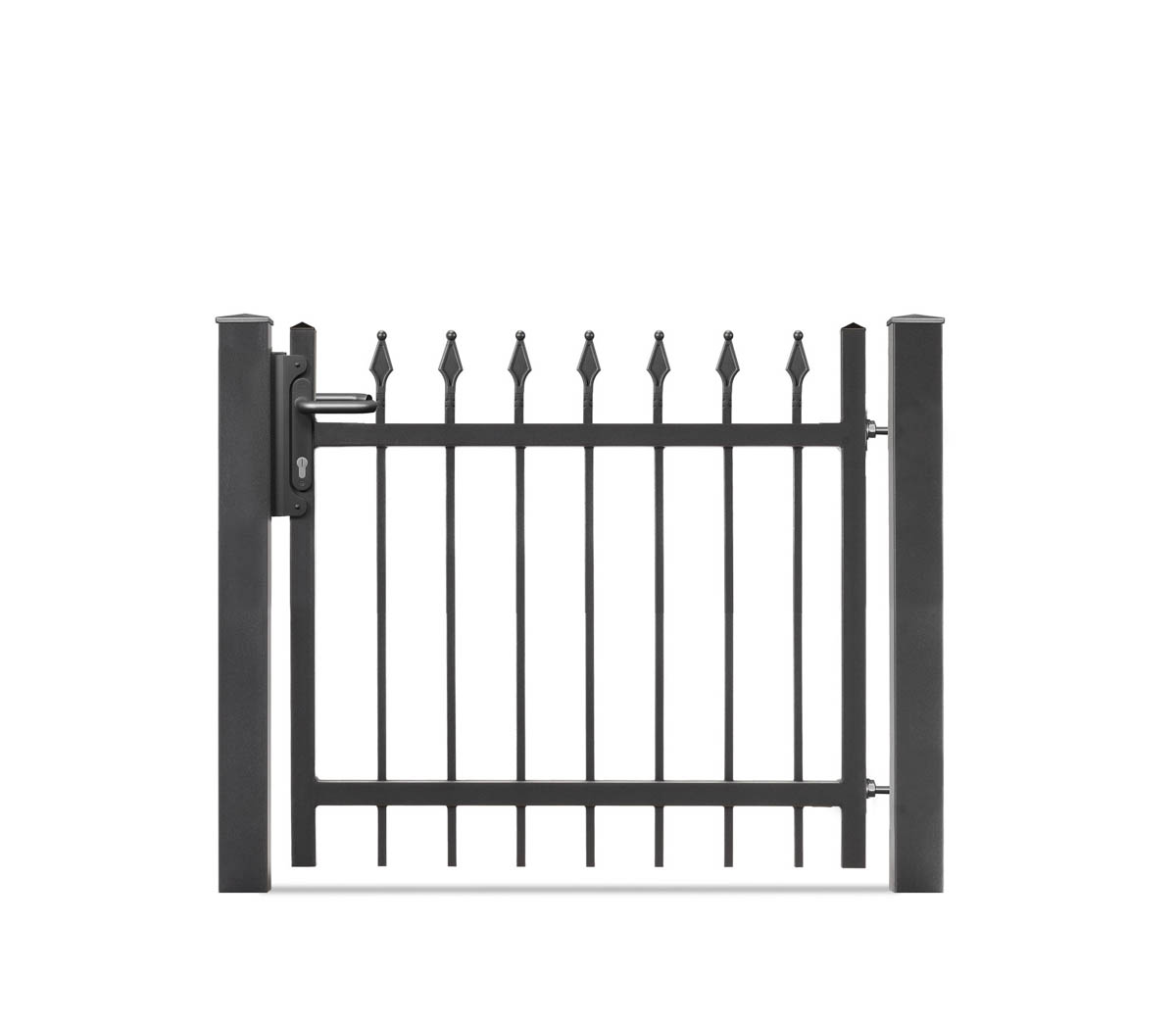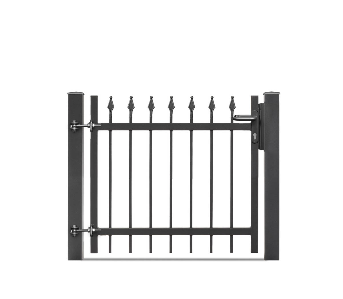 ZERMATT mit den klassischen Zierspitzen ist das passende Tor zu unserem Zaunmodell Residenzen select+ ZERMATT. Es ist in zwei Breiten und vier Höhen als 1-flügelige Variante erhältlich. Als Einfahrtstor stehen die 2-flügelige Varianten mit den Lichten Weite von 3215 mm und 2095 mm (90° Öffnungswinkel) zur Auswahl. Alle Tore sind feuerverzinkt und hochwertig mit DB703 eisenglimmer pulverbeschichtet. Das garantiert eine langlebige Qualität.