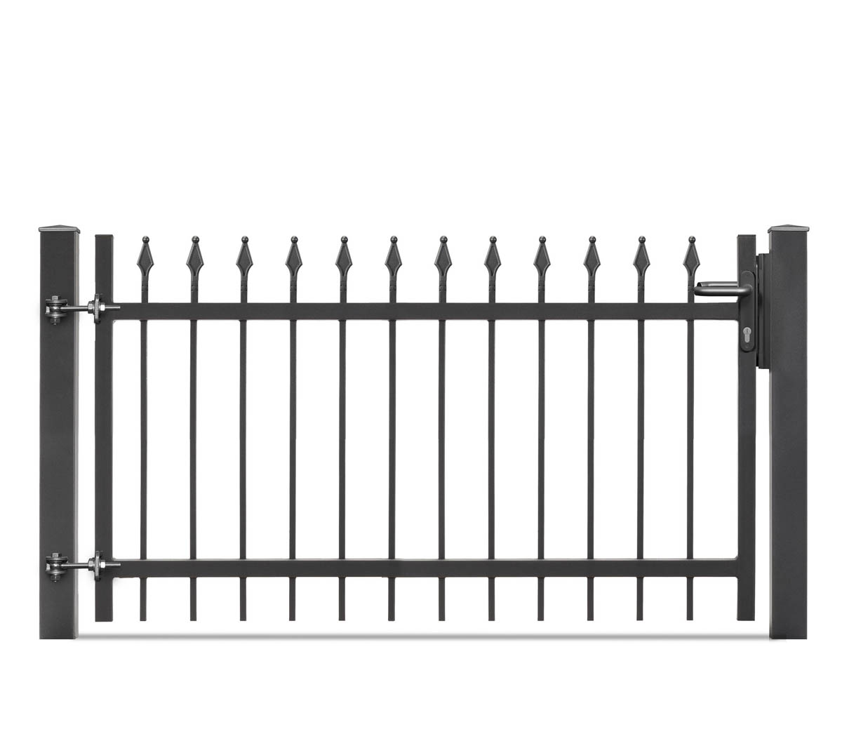 ZERMATT mit den klassischen Zierspitzen ist das passende Tor zu unserem Zaunmodell Residenzen select+ ZERMATT. Es ist in zwei Breiten und vier Höhen als 1-flügelige Variante erhältlich. Als Einfahrtstor stehen die 2-flügelige Varianten mit den Lichten Weite von 3215 mm und 2095 mm (90° Öffnungswinkel) zur Auswahl. Alle Tore sind feuerverzinkt und hochwertig mit DB703 eisenglimmer pulverbeschichtet. Das garantiert eine langlebige Qualität.