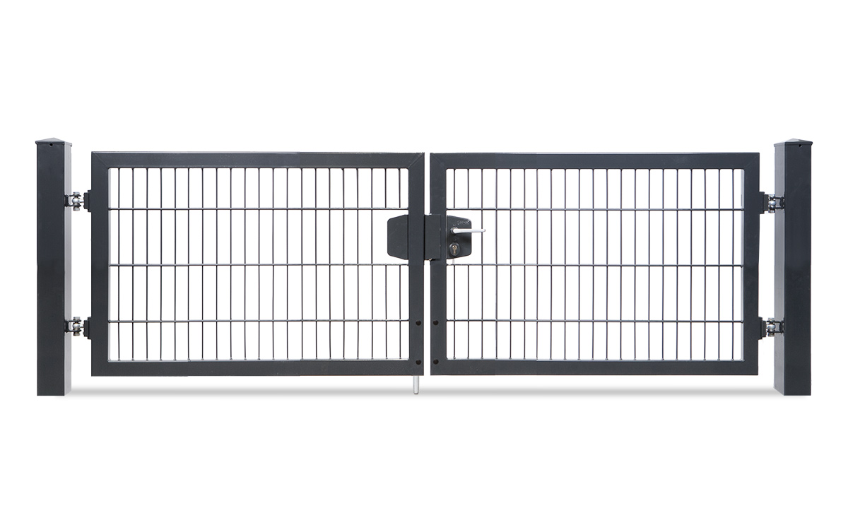 Das zweiflügelige Einfahrtstor VARIO trend lässt Sie die Öffnungsrichtung nach DIN links und rechts durch entsprechende Pfostenmontage bestimmen. Das variable Einfahrtstor kommt als Komplettpaket mit Doppelstabfüllung von 8/6/8mm, einem Rahmen von 60/40 mm und den zugehörigen Torpfosten je nach Höhe des Tores von 60/60 mm oder 80/80 mm zu Ihnen nach Hause. Aus zahlreichen Torhöhen und Torbreiten können Sie das für Sie passende Tor auswählen.