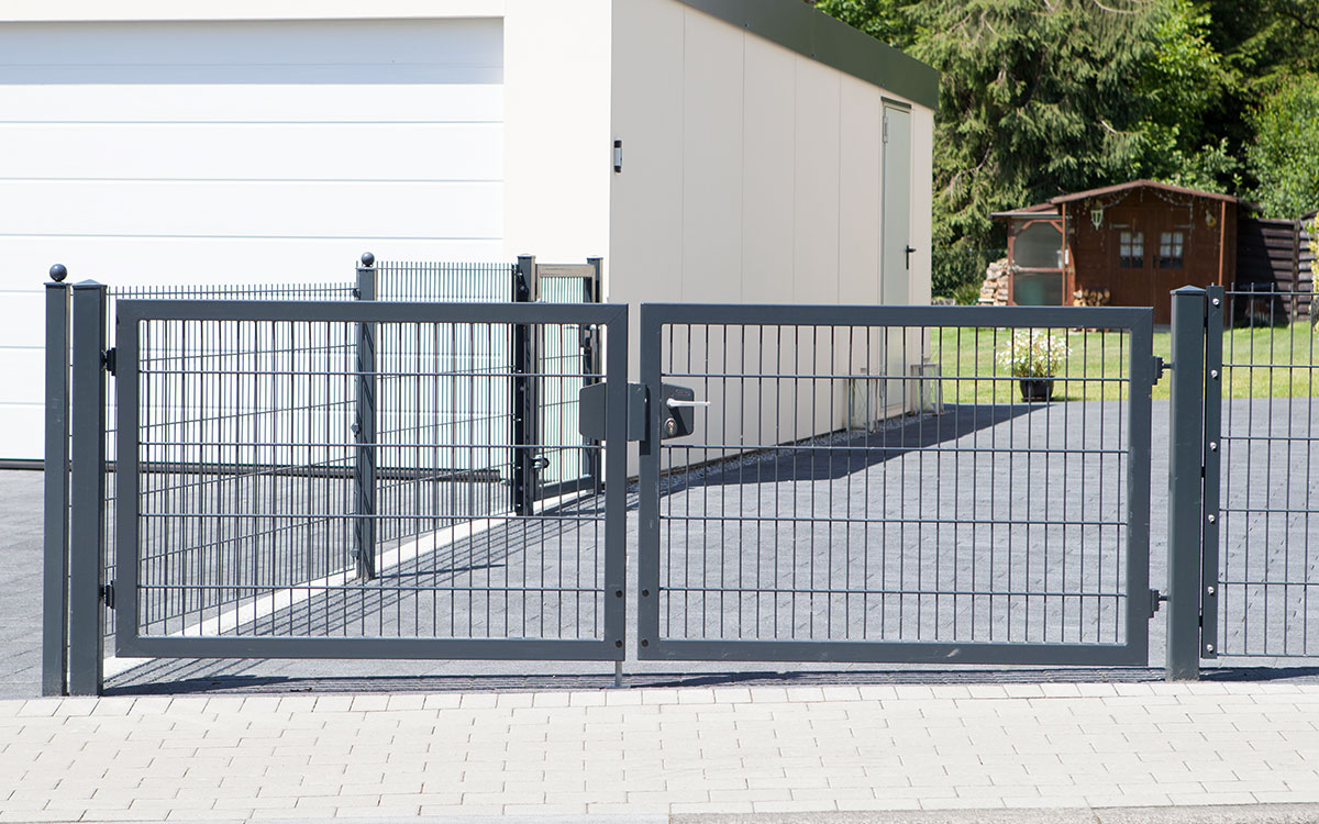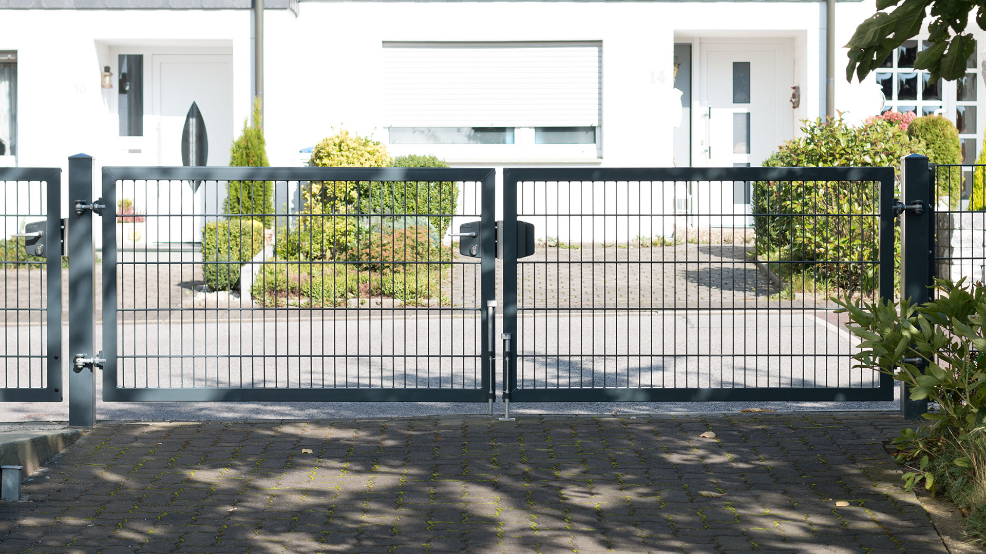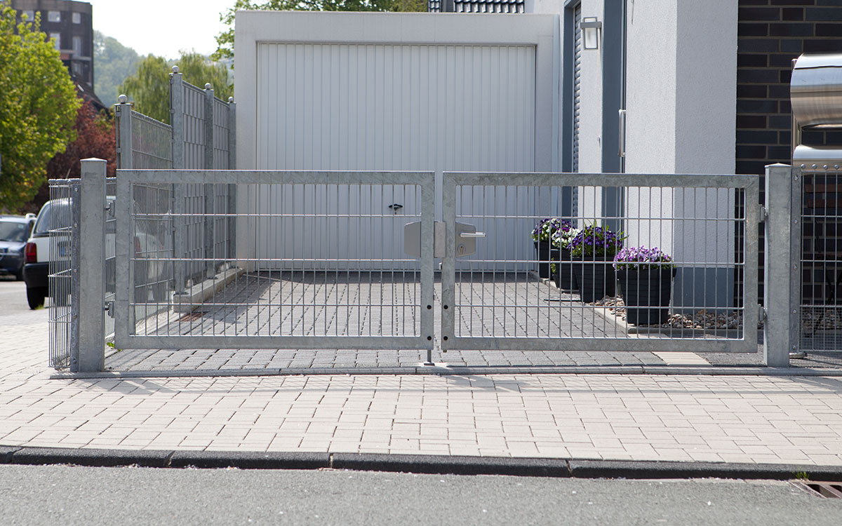 Das zweiflügelige Einfahrtstor VARIO trend lässt Sie die Öffnungsrichtung nach DIN links und rechts durch entsprechende Pfostenmontage bestimmen. Das variable Einfahrtstor kommt als Komplettpaket mit Doppelstabfüllung von 8/6/8mm, einem Rahmen von 60/40 mm und den zugehörigen Torpfosten je nach Höhe des Tores von 60/60 mm oder 80/80 mm zu Ihnen nach Hause. Aus zahlreichen Torhöhen und Torbreiten können Sie das für Sie passende Tor auswählen.