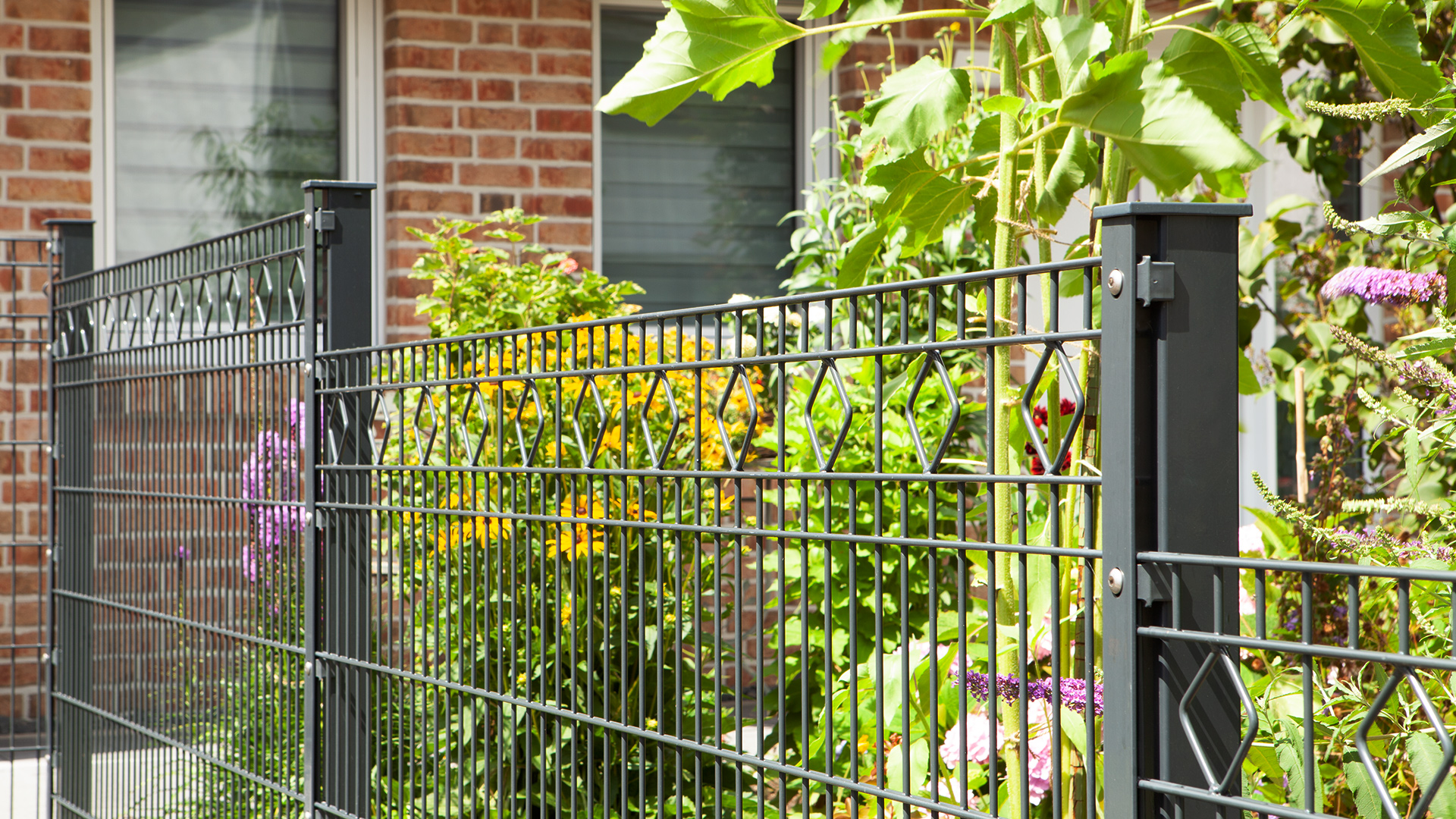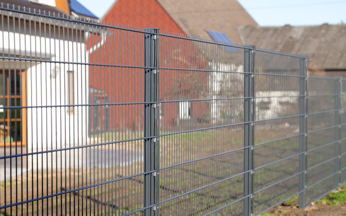 Die untere Zaunklammer hat einen kürzeren Abstand, sodass die Zaunklammer im unteren Teil des Gittermattenfeldes sitzt. Sie dient so als Aushängesicherung.