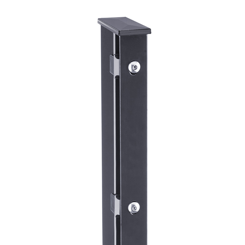 Der AA-Pfosten bietet eine durchgehende Abdeckleiste, die den Stoß der Zaungitter verdeckt. Außerdem dämmt der stabile Pfosten Geräusche, da die Distanzhalter den direkten Kontakt von Zaungitter und Pfosten verhindern. Wählen Sie aus den Varianten feuerverzinkt oder den RAL Farben moosgrün beschichtet und anthrazit beschichtet aus. Auf Wunsch können Sie auch Sonderfarben oder Effektfarben erhalten.